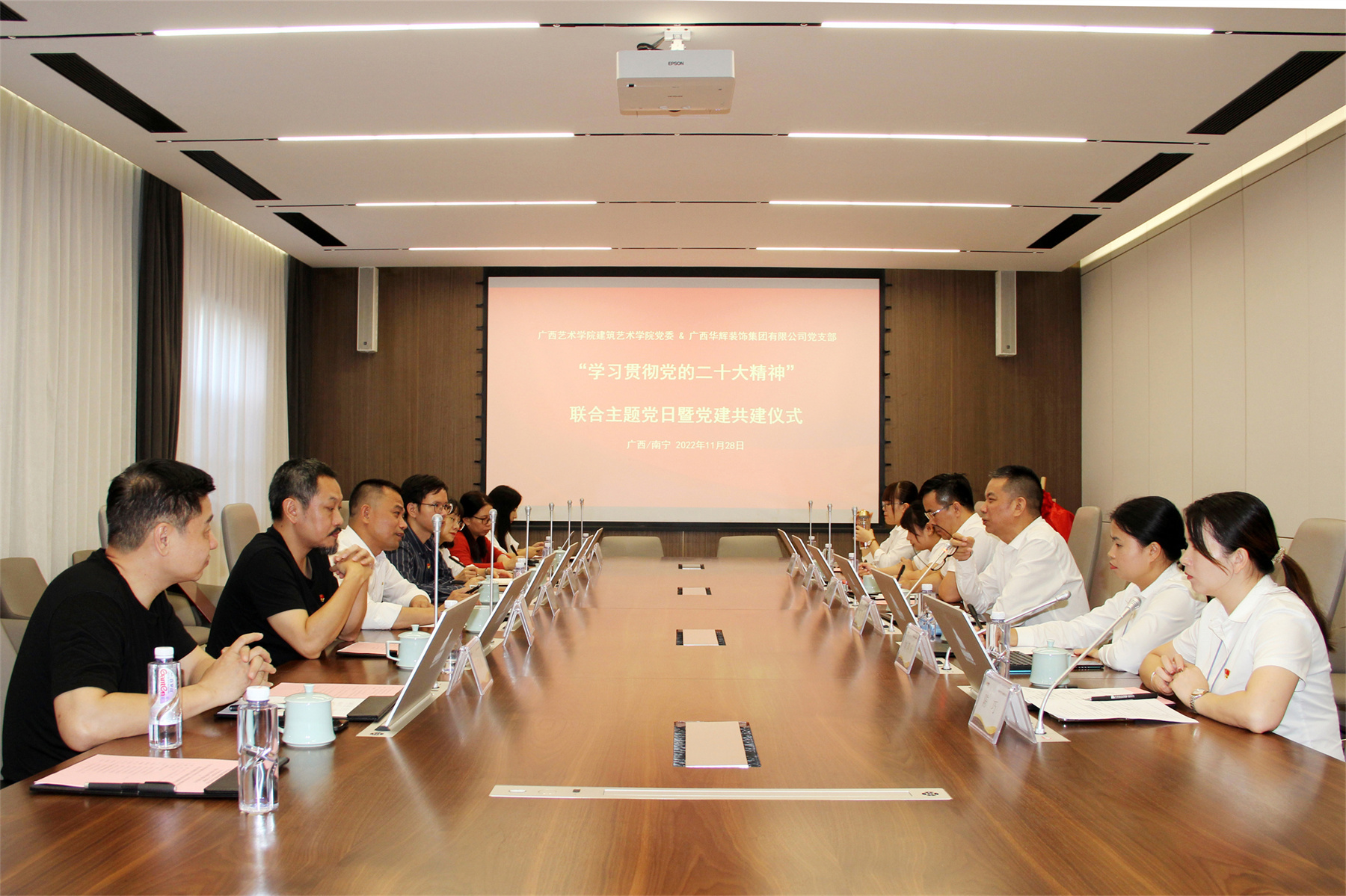2022年11月28日,广西艺术学院建筑艺术学院党委与广西太阳成tyc7111cc官网装饰集团有限公司党支部,开展“学习贯彻党的二十大精神”联合主题党日暨党建共建仪式;同时,广西艺术学院建筑艺术学院与广西太阳成tyc7111cc官网装饰集团有限公司,举行了“联合共建校外实践教育基地”揭牌仪式。