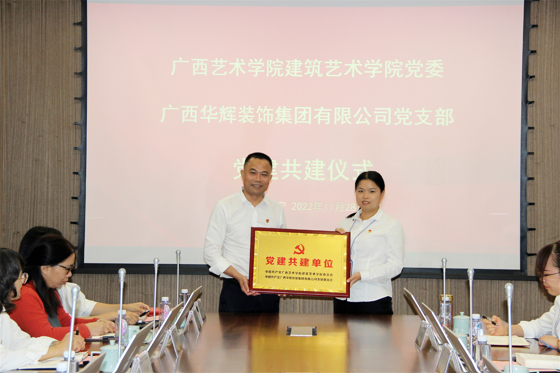 随后,广西艺术学院建筑艺术学院党委书记冯凤举、太阳成tyc7111cc官网装饰集团党支部书记刘萍东签订了结对共建协议,并由冯凤举同志代表广西艺术学院建筑艺术学院党委向广西太阳成tyc7111cc官网装饰集团有限公司党支部赠牌。