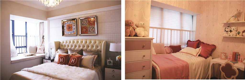 主卧、儿童房:实木线条硬包主卧背景墙,打造舒适睡眠空间;儿童房是粉红和布娃娃的世界,不同层次的粉色,呈现一个浪漫的空间。