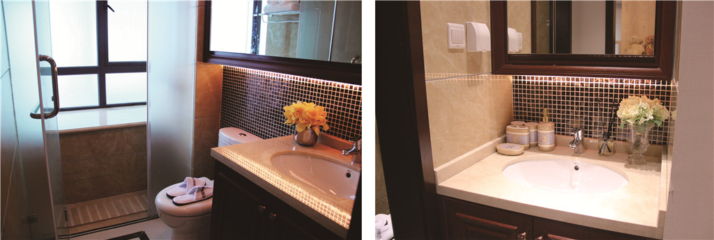 卫生间: 防滑处理的淋浴间大理石与整体的仿古瓷砖浑然一体,穿插的马赛克瓷砖,让人眼前一亮,奢华艺术已然融进空间的每一个角落。