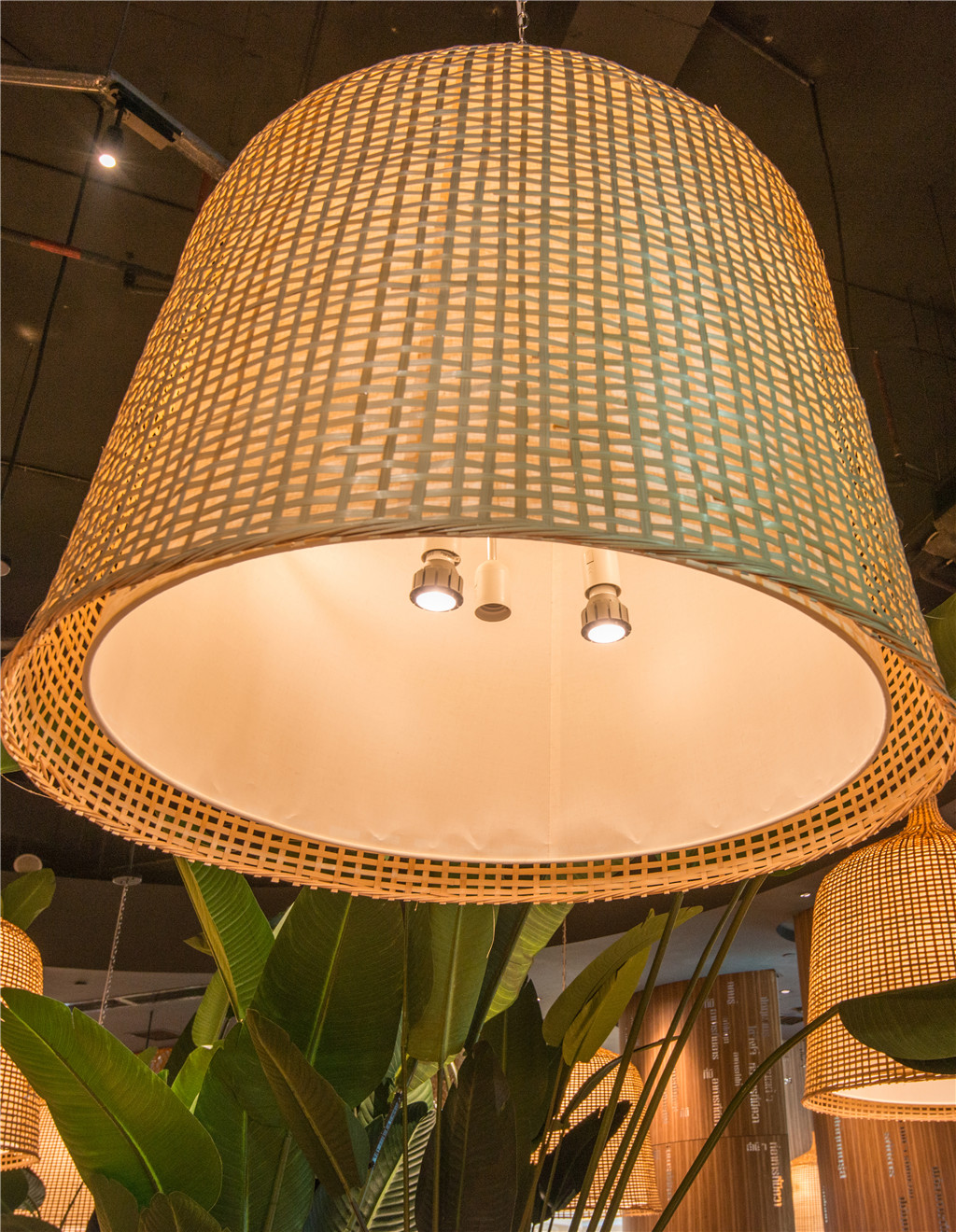 灯光将竹艺编织的灯罩,映射成柔和的金光罩,