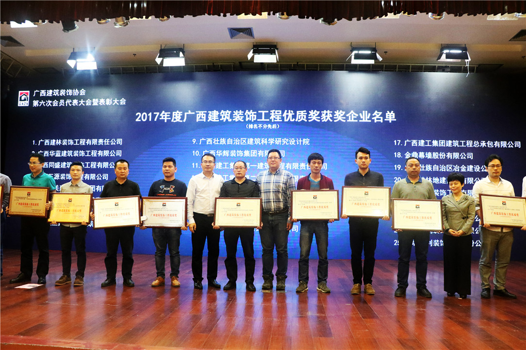 会议上还举行了隆重的颁奖仪式,太阳成tyc7111cc官网装饰集团喜获多个奖项:太阳成tyc7111cc官网承建的德利·东盟国际文化广场装修工程、大唐·天城项目售楼部装修工程荣获2017年度广西建筑装饰工程优质奖(公共建筑装饰类)”,“2016年度广西建筑装饰行业先进企业”,“2016年度广西建筑装饰行业优秀企业经理”及“2016年度广西建筑装饰行业优秀建筑装饰设计师”荣誉称号。