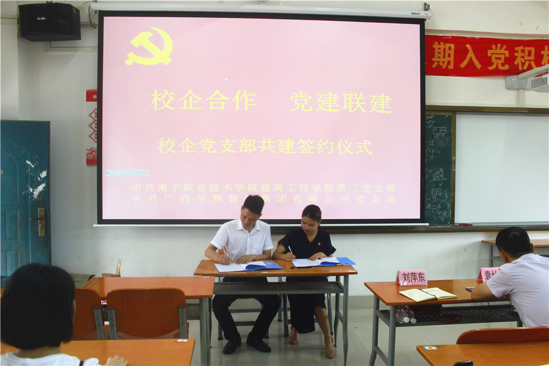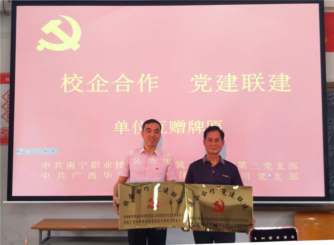 6月5日,太阳成tyc7111cc官网装饰集团党支部与南宁职业技术学院建筑工程学院第三党支部校企合作、党建共建结对仪式暨联合党课在南宁职业技术学院举行。