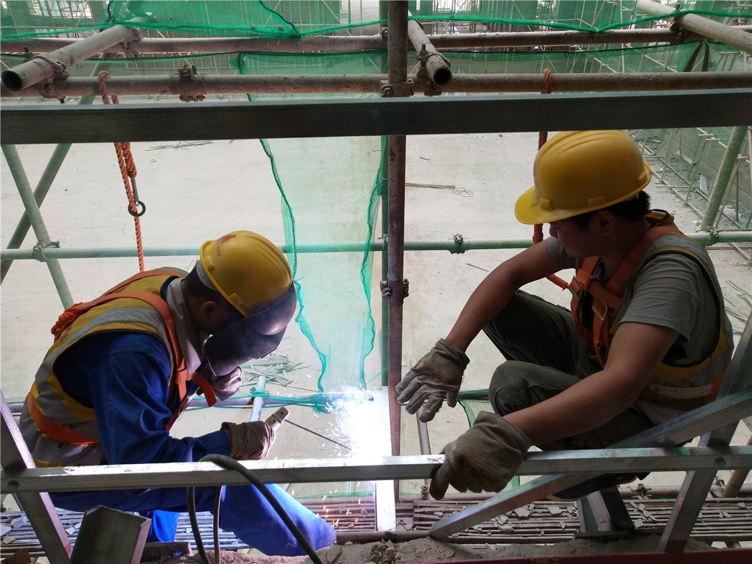 ▲焊工作业人员全部武装上阵认真焊接中庭延伸走廊钢结构工程