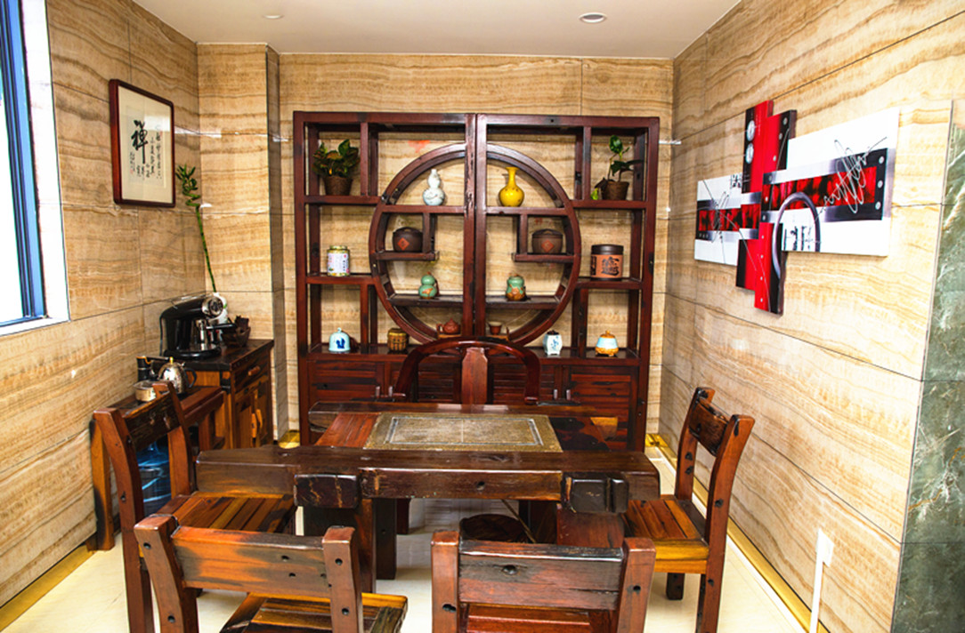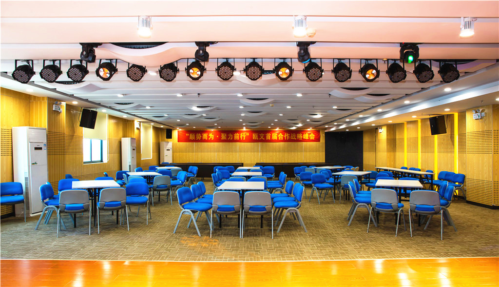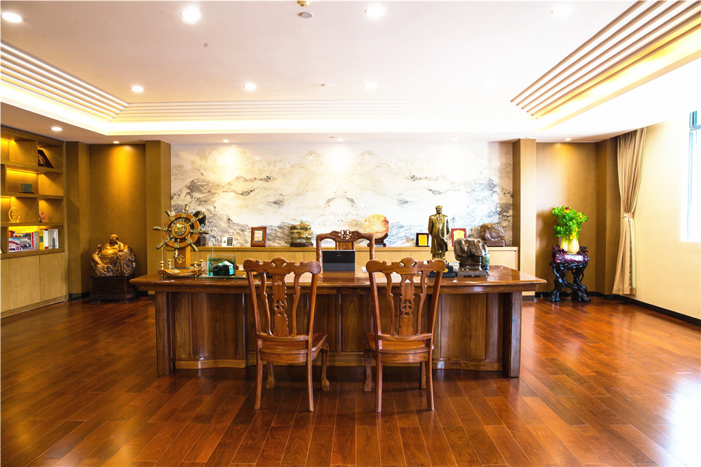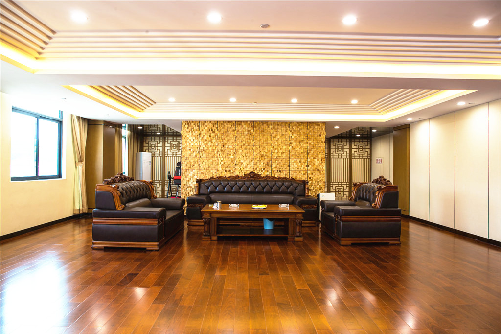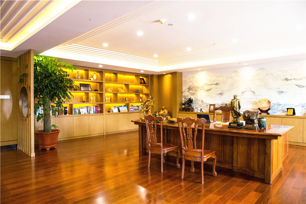 取水之蓝、家之皇为元素,以木饰面、陶瓷、大理石为载体,应用于墙面、地面、主背景墙。体现了瓯文集团厚德载物,开放包容,儒雅热情迎八方来客的气魄。