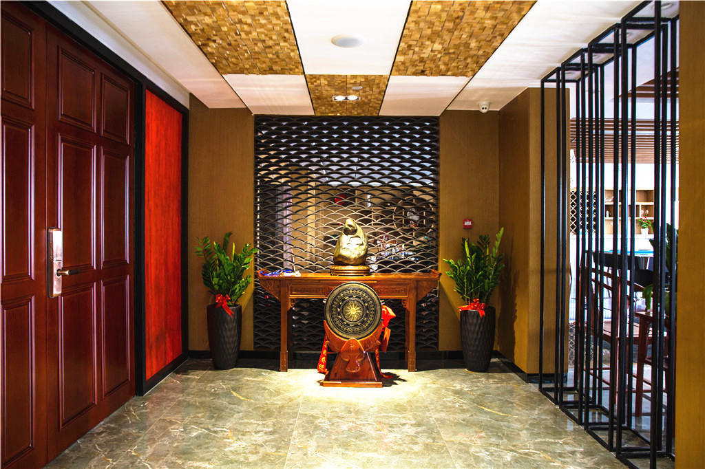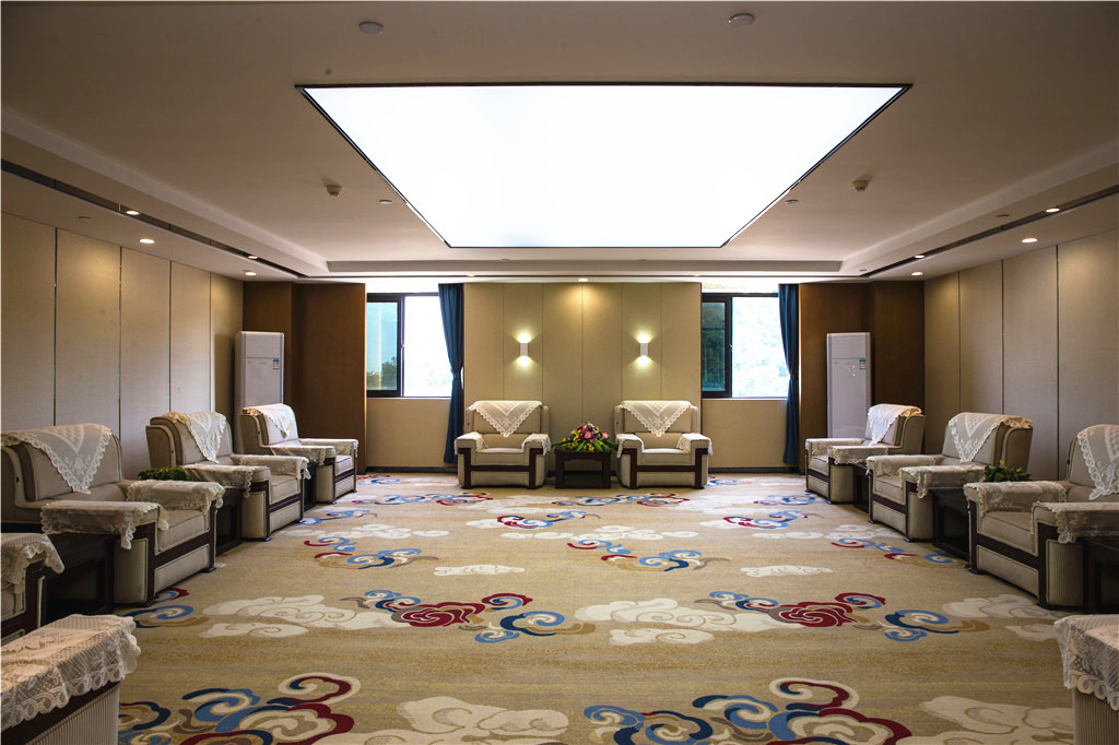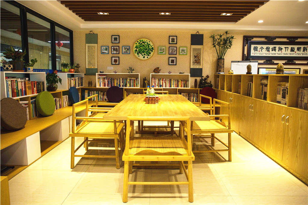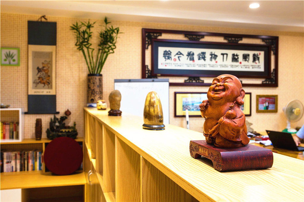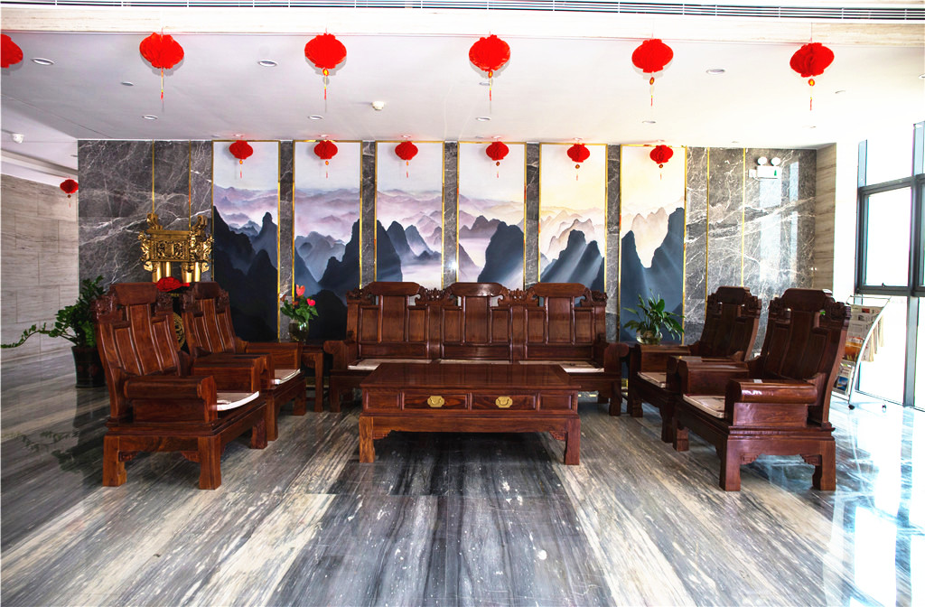 取水之蓝、家之皇为元素,以木饰面、陶瓷、大理石为载体,应用于墙面、地面、主背景墙。体现了瓯文集团厚德载物,开放包容,儒雅热情迎八方来客的气魄。