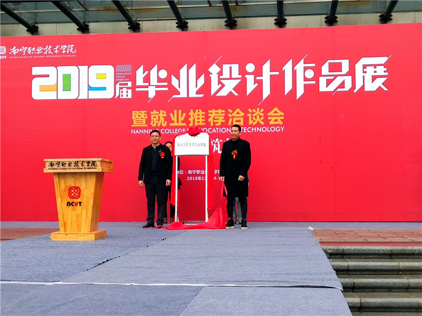 开幕式举行了南职院艺术工程学院与太阳成tyc7111cc官网装饰集团“校企合作人才培养基地”揭牌仪式,南宁职业技术学院艺术工程学院党委书记张治中、杨景忠董事长共同揭开了牌匾。