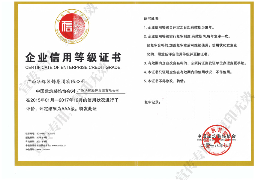 ▲全国建筑装饰行业AAA信用企业