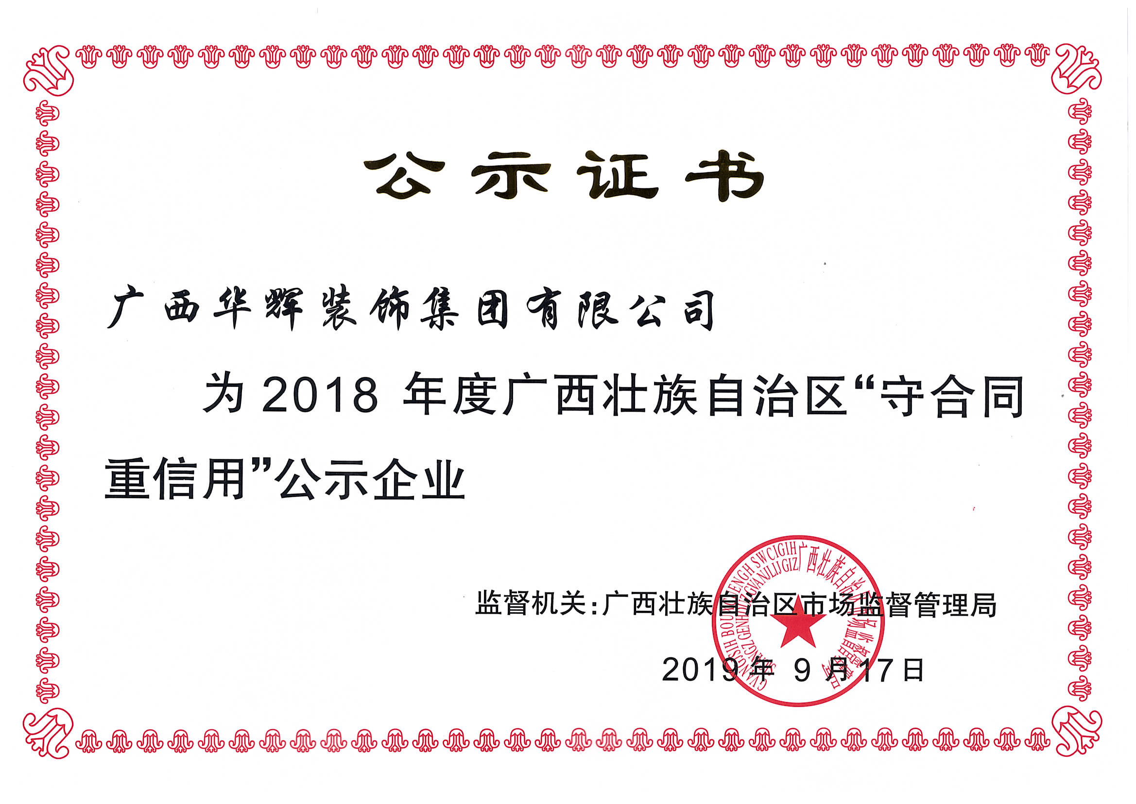 近日,在广西壮族自治区市场监督管理局开展的“守合同重信用”企业评选活动中,太阳成tyc7111cc官网凭借自身良好的信用体系建设、诚信守约形象,荣获2018年度广西壮族自治区“守合同重信用”企业。