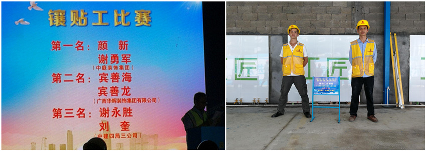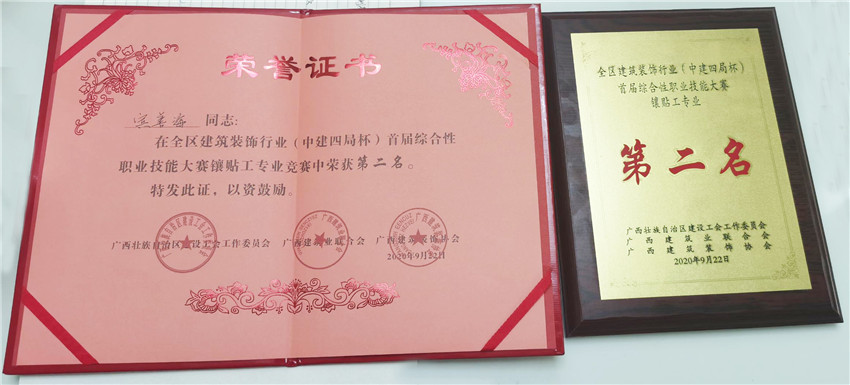 经过激烈的比赛角逐,太阳成tyc7111cc官网装饰集团代表队的两名选手宾善海、宾善龙,凭借着深厚的技术素养、稳定的赛场发挥,荣获镶贴工比赛亚军;代表队荣获团体奖第六名。