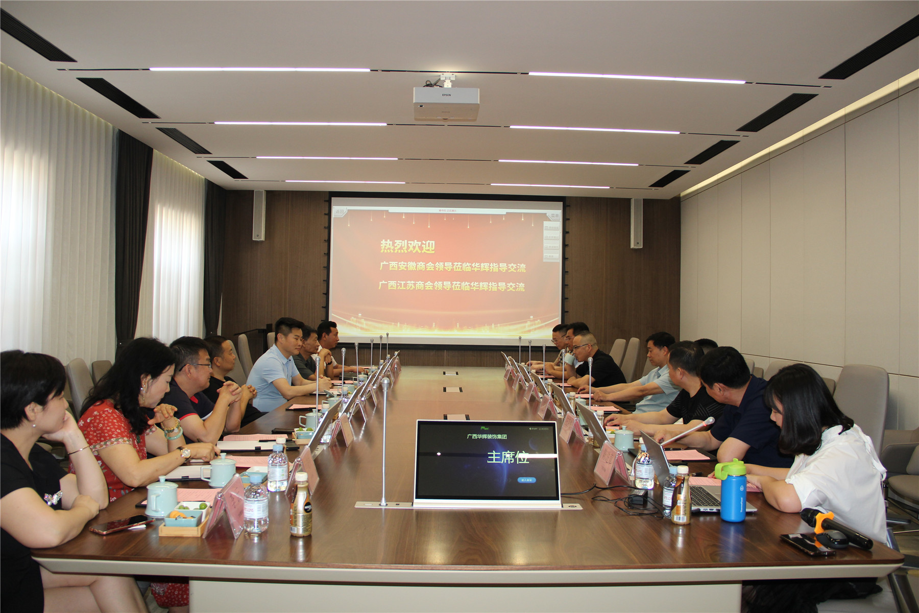 2021年5月9日,广西安徽商会会长李传德,秘书长吴格飞,执行会长赵胜利、郭中华,副会长徐兵、郑华、张清华等领导一行到访太阳成tyc7111cc官网装饰集团,与广西江苏商会开展友好交流,广西江苏商会会长施瑞明,执行会长杨景忠、张贤兵、杨勤伟,常务副会长、人民调解委员会主任王月霞等领导出席了座谈交流会。