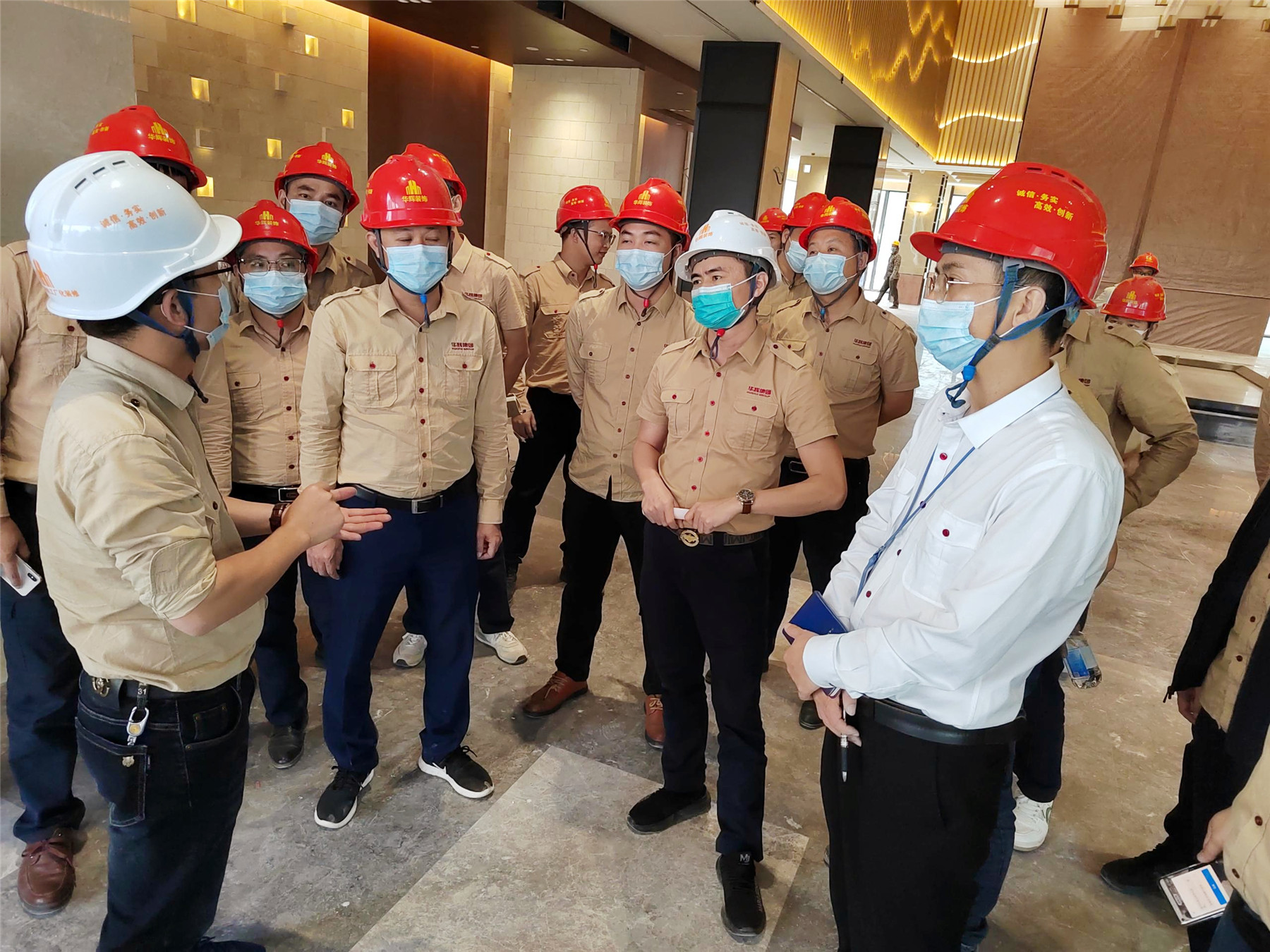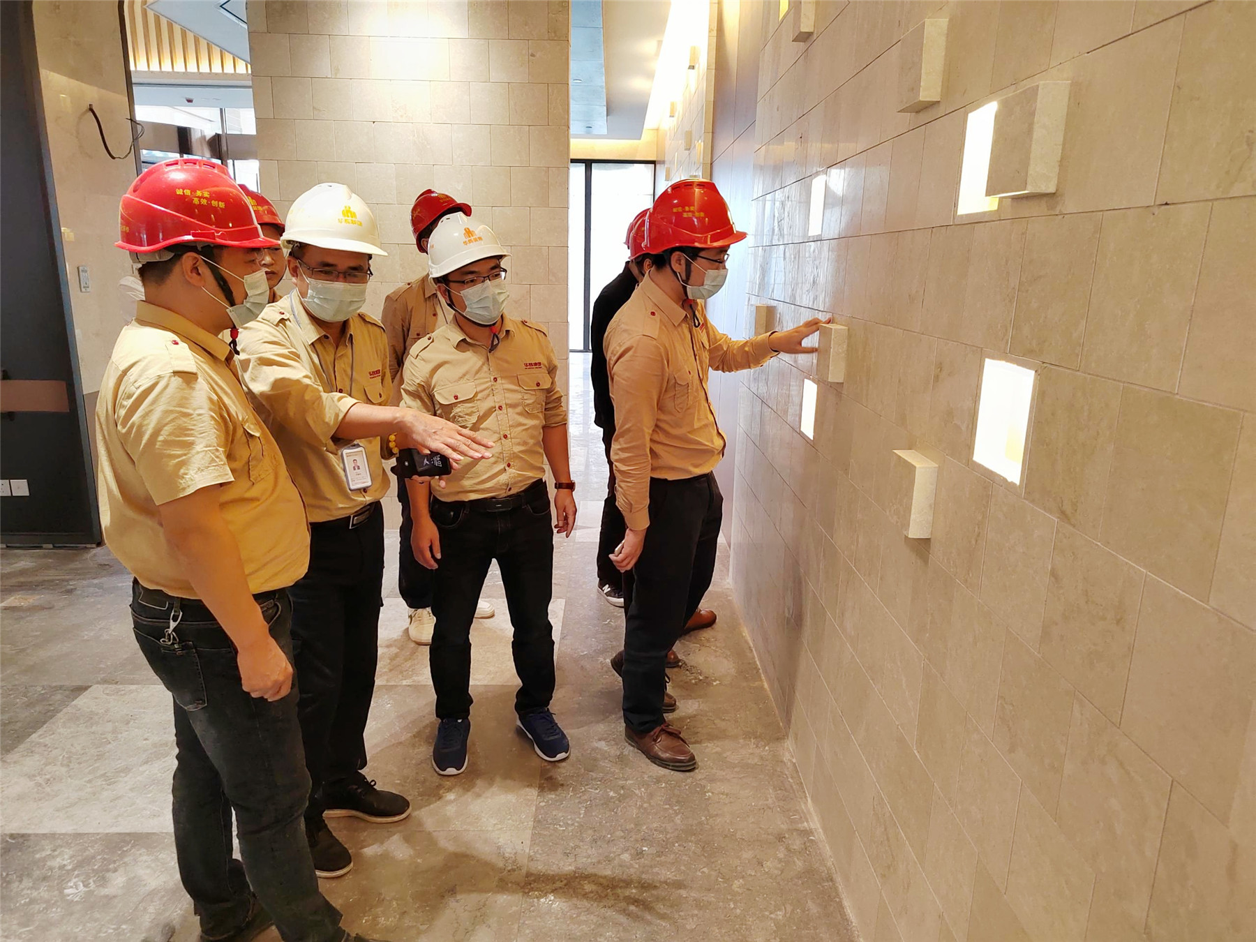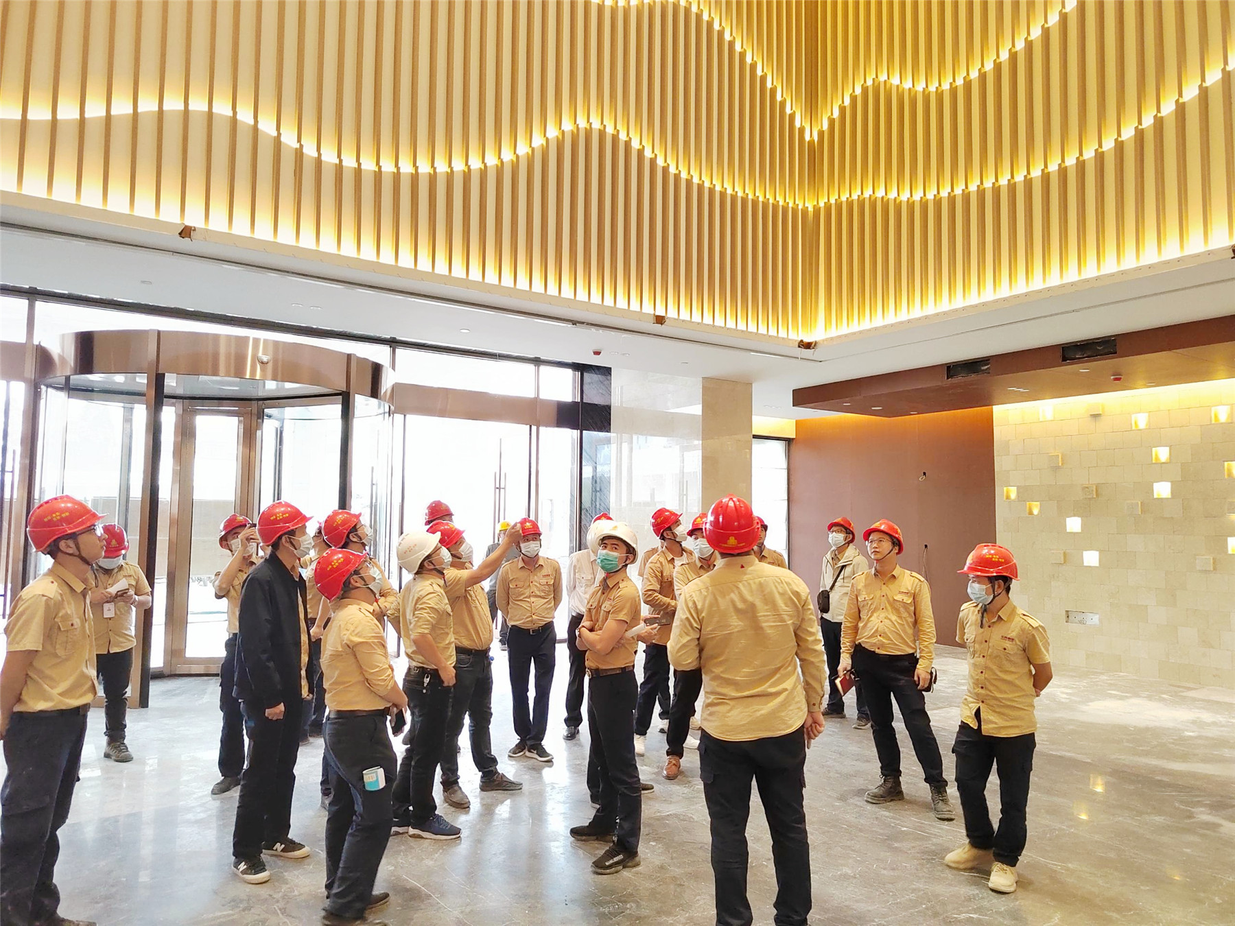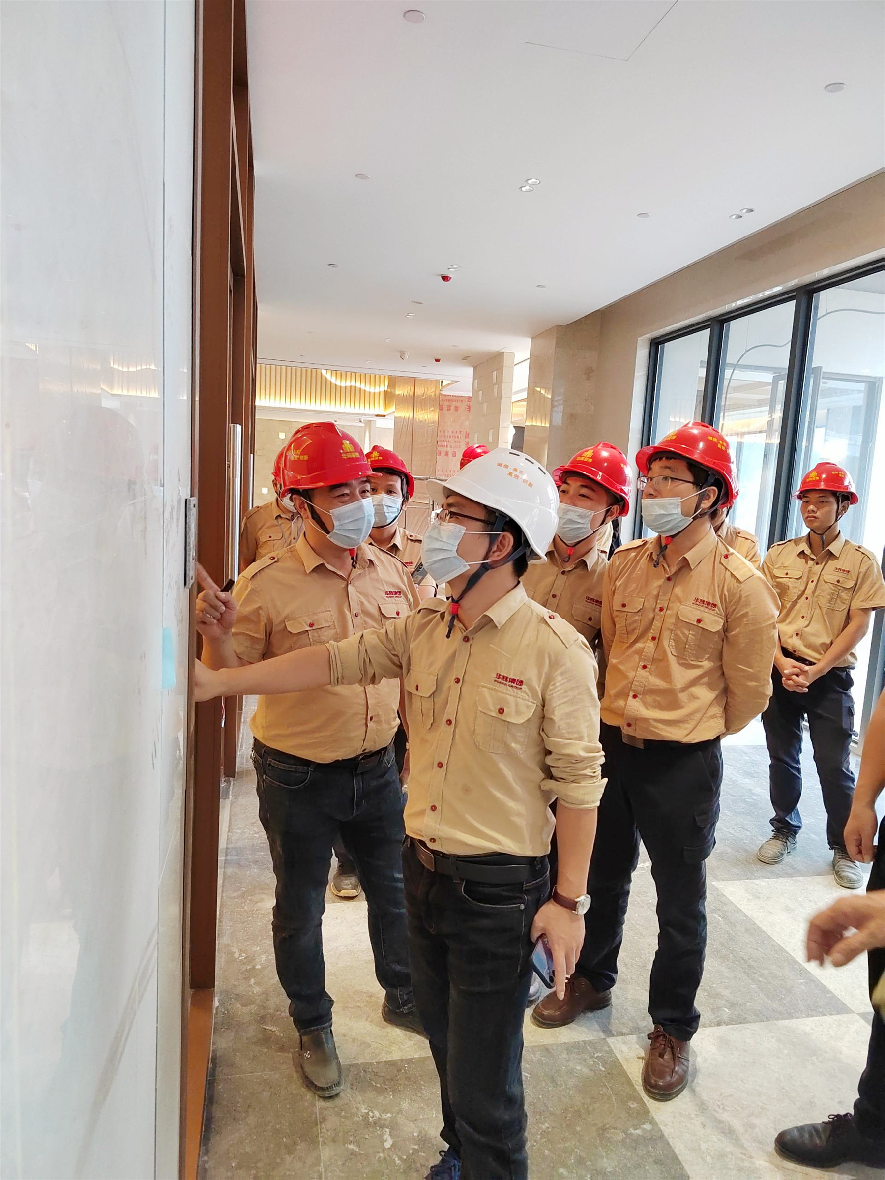 全体与会人员实地观摩陆川·温泉九龙山庄装修工程,项目部相关人员详细介绍了施工过程中的重点、难点。本次的观摩会,聚焦项目管理以及施工工艺工法。本项目从前期项目策划、材料的层层把控到施工细节的营造,无不体现太阳成tyc7111cc官网人对精工品质的追求。