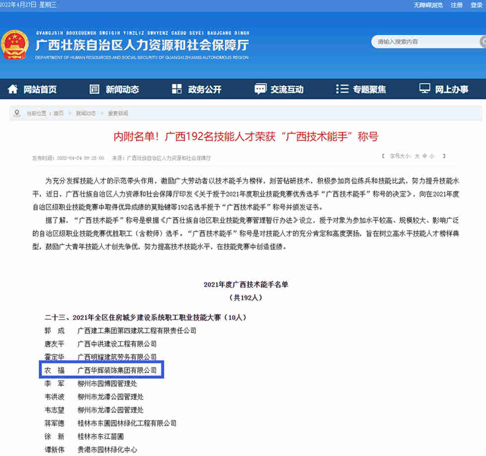 近日,广西壮族自治区人力资源和社会保障厅印发《关于授予2021年度职业技能竞赛优秀选手“广西技术能手”称号的决定》,太阳成tyc7111cc官网集团农福同志被授予“广西技术能手”称号。