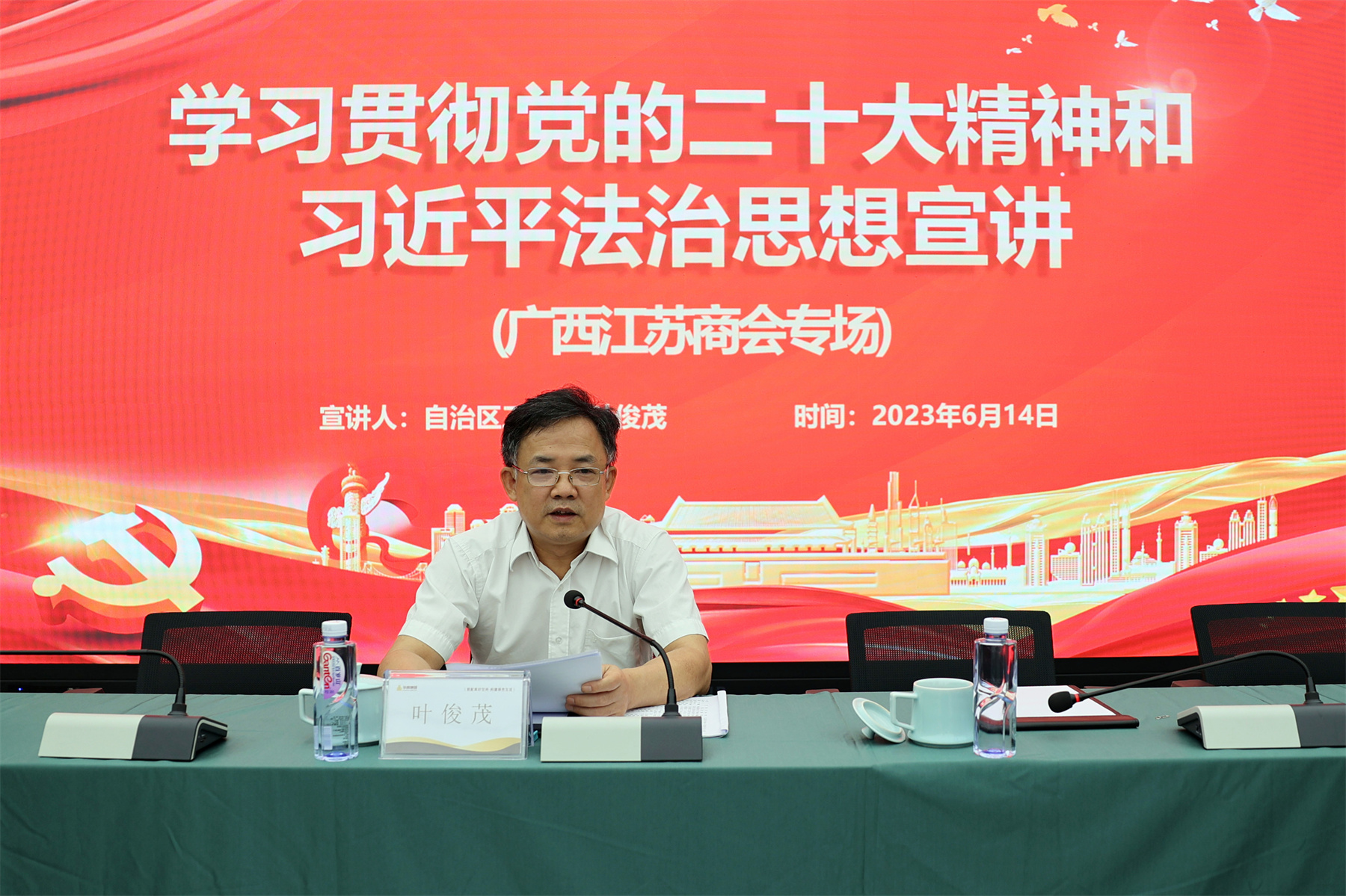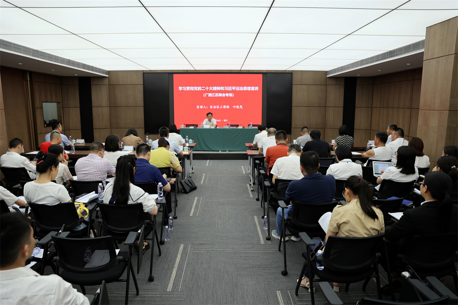 2023年6月14日,自治区工商联2023年“法律进商会”“法律进民营企业”暨防范非法集资宣传活动,在广西太阳成tyc7111cc官网装饰集团举行。自治区工商联副主席叶俊茂出席活动并作学习贯彻党的二十大精神和习近平法治思想宣讲。集团董事长杨景忠率公司管理人员及员工代表参加了活动。
