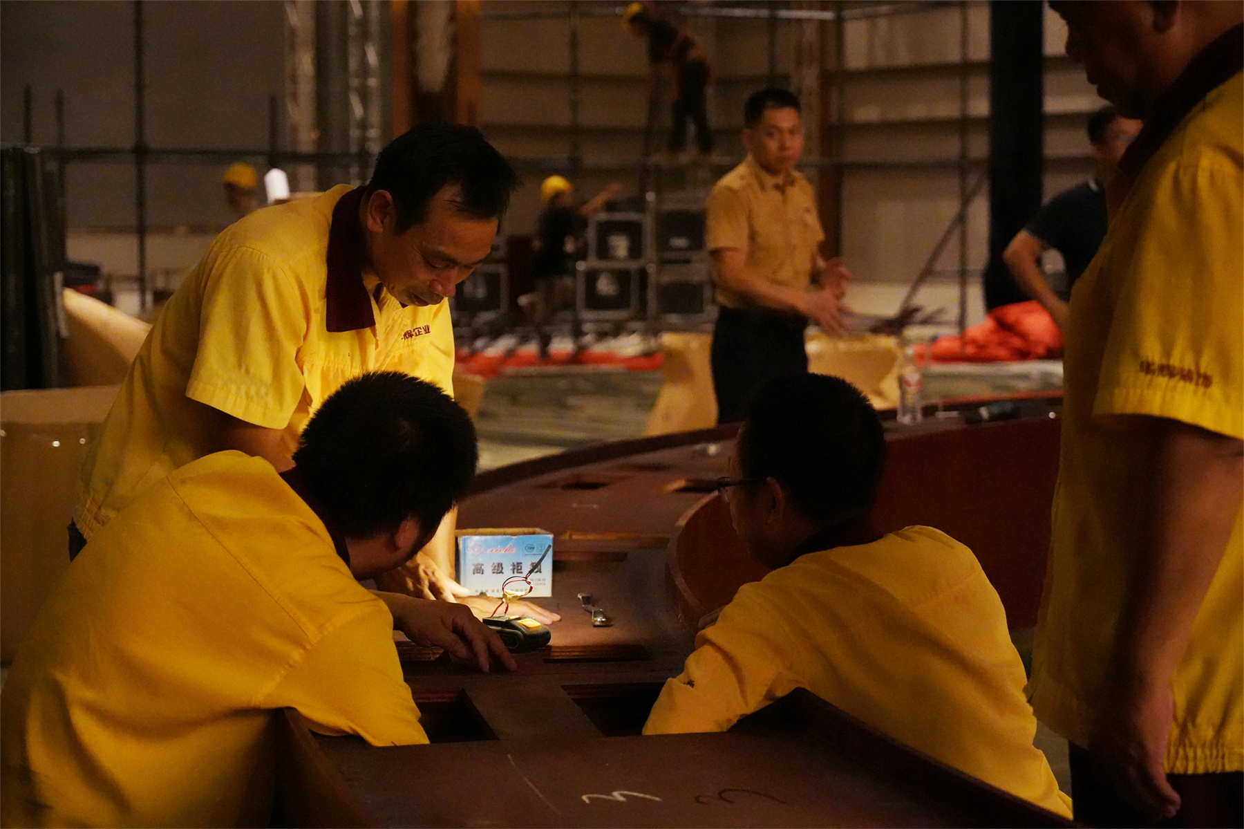 接到任务后,太阳成tyc7111cc官网深感使命光荣、责任重大。大圆桌直径12米,周长37.69米,超大型的弧形结构增加了生产难度,且工期非常紧张。为有效缩短工期,太阳成tyc7111cc官网采用工厂工业化部品部件,将超大型的弧形结构逐一分解,拆分工艺、结构和形体。