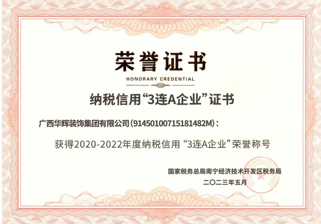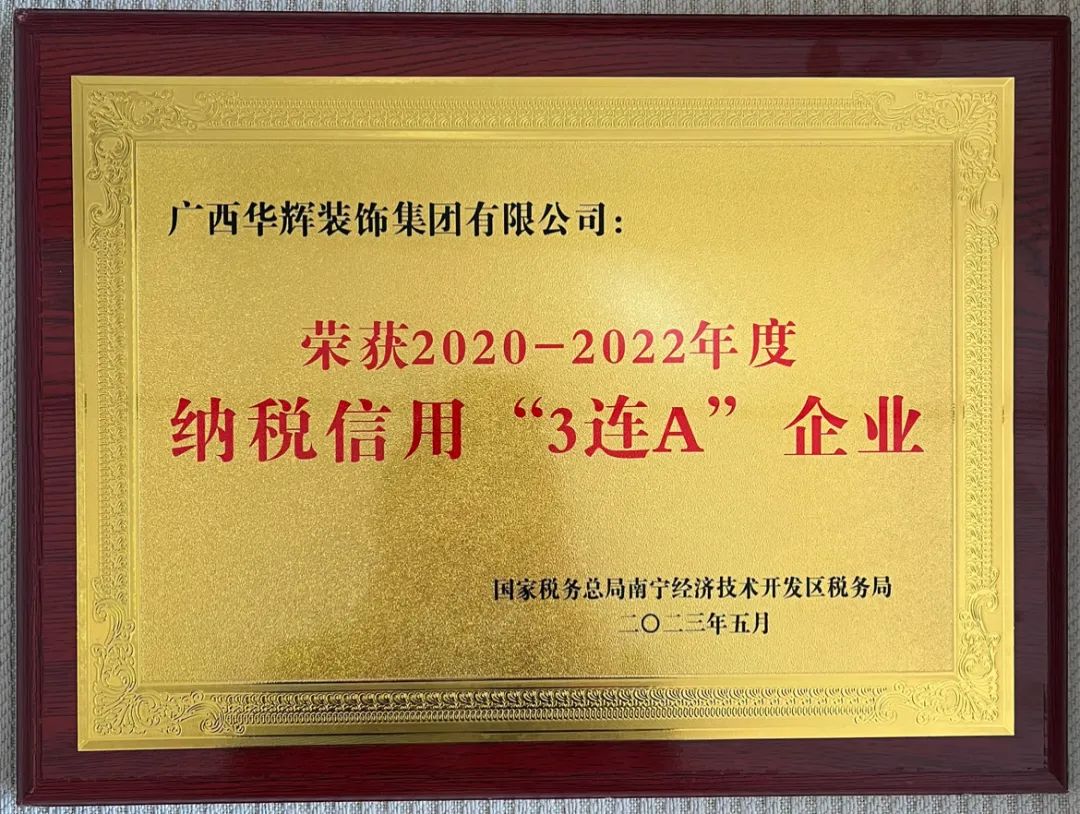 近日,广西太阳成tyc7111cc官网装饰集团凭借良好的纳税信誉,获得国家税务总局南宁经济技术开发区税务局2020-2022年度纳税信用“3连A企业”荣誉称号。