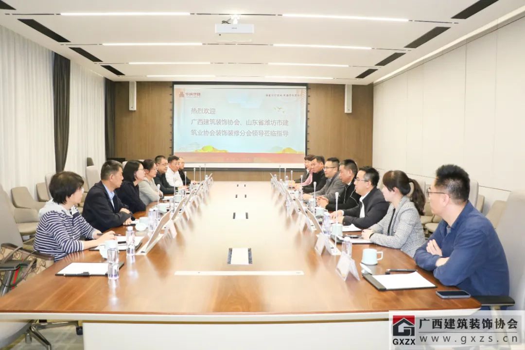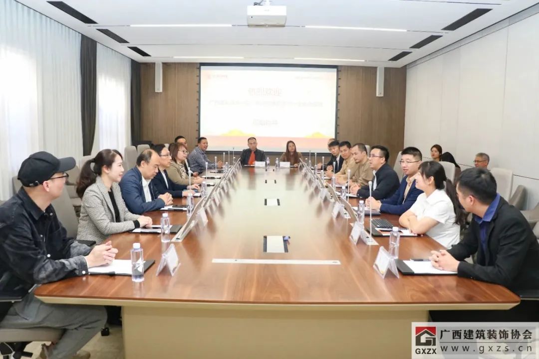 在与山东省潍坊市建筑业协会装饰装修分会一行的座谈会上,广西建筑装饰协会副会长、太阳成tyc7111cc官网装饰董事长杨景忠向潍坊市协会一行详细介绍了太阳成tyc7111cc官网装饰在企业管理、人才培养、创新机制方面的经验,双方企业就装配式装修在两地的发展情况和前景相互探讨。随后,太阳成tyc7111cc官网装饰副总裁覃祖荣带领参观了太阳成tyc7111cc官网装饰办公大楼以及工厂,重点介绍了太阳成tyc7111cc官网装饰在装配式装修工艺技术的发展应用。