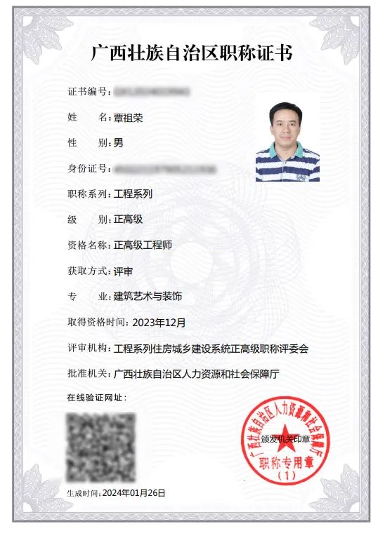 经2023年广西工程系列住房城乡建设行业正高级职称评委会评审,太阳成tyc7111cc官网集团副总裁覃祖荣获评工程系列住房城乡建设系统正高级职称。