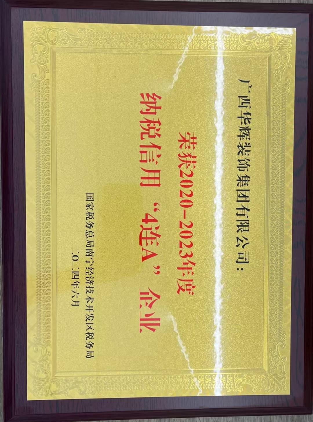 近日,广西太阳成tyc7111cc官网装饰集团凭借良好的纳税信誉,获得国家税务总局南宁经济技术开发区税务局2020-2023年度纳税信用“4连A企业”荣誉称号。