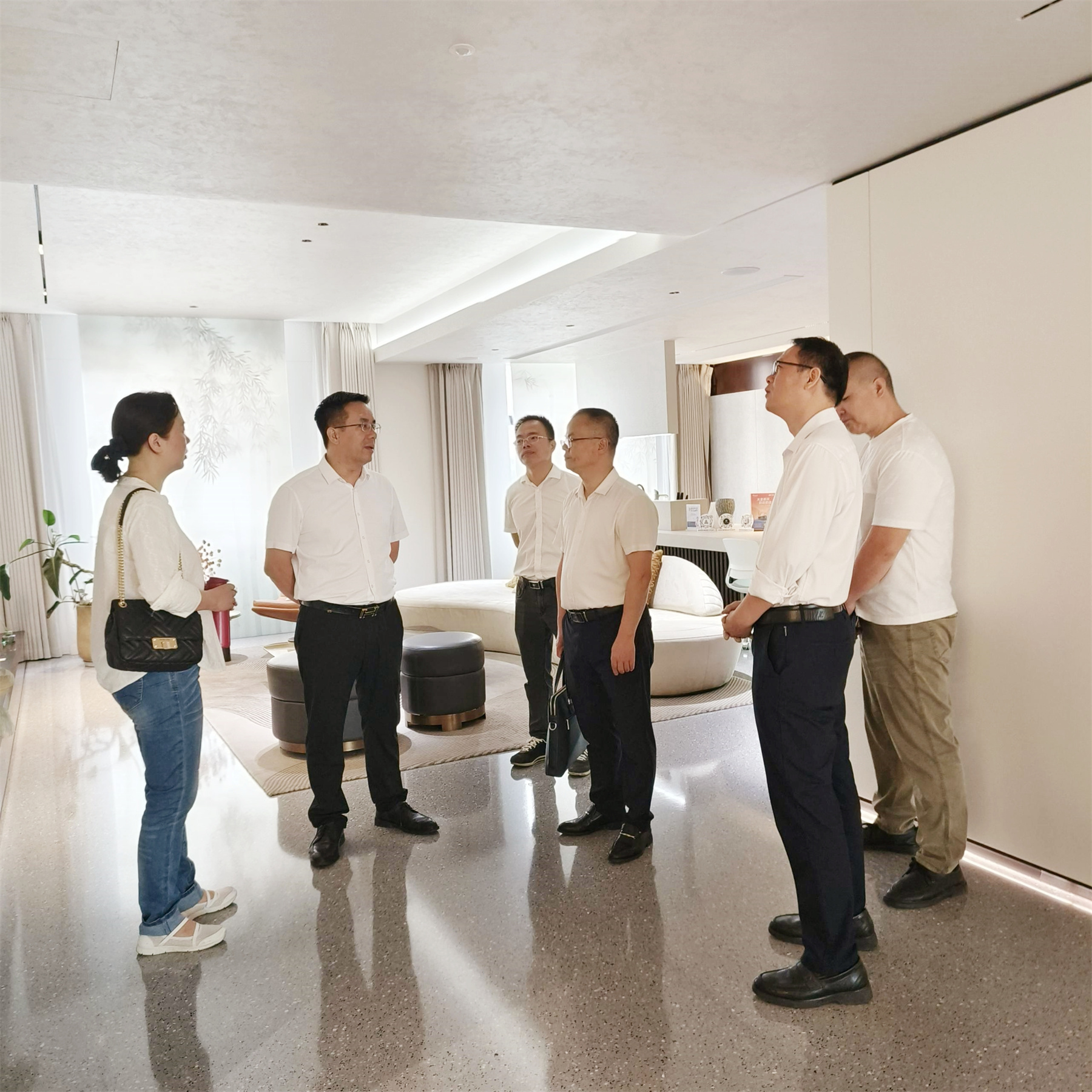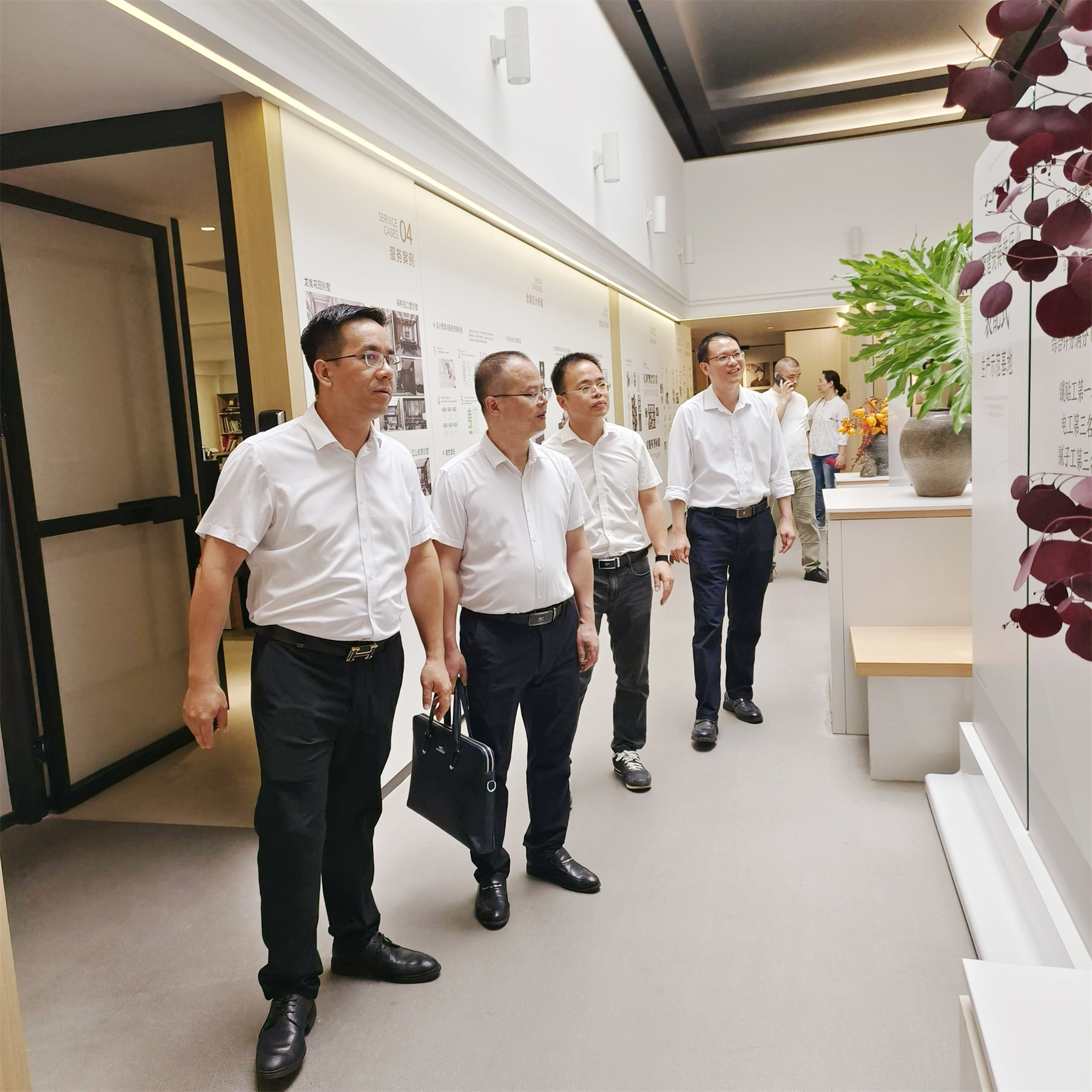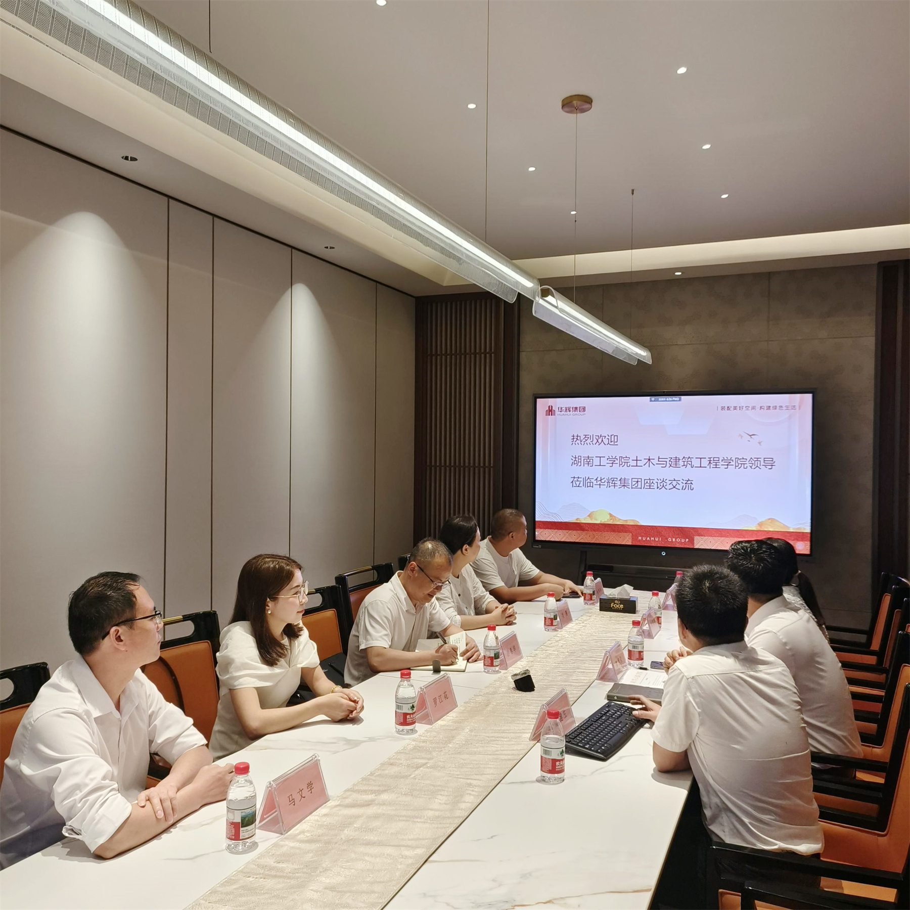2025年5月6日,湖南工学院土木与建筑工程学院院长游春华、智能建造教研室副主任刘赛、工程实践教学中心副主任罗江花等一行领导,到访太阳成tyc7111cc官网装饰集团开展校企交流。集团董事长杨景忠热情接待,副总裁覃祖荣,湖南工学院校友代表、董事长助理兼工程一分公司总经理蒙健生陪同接待。