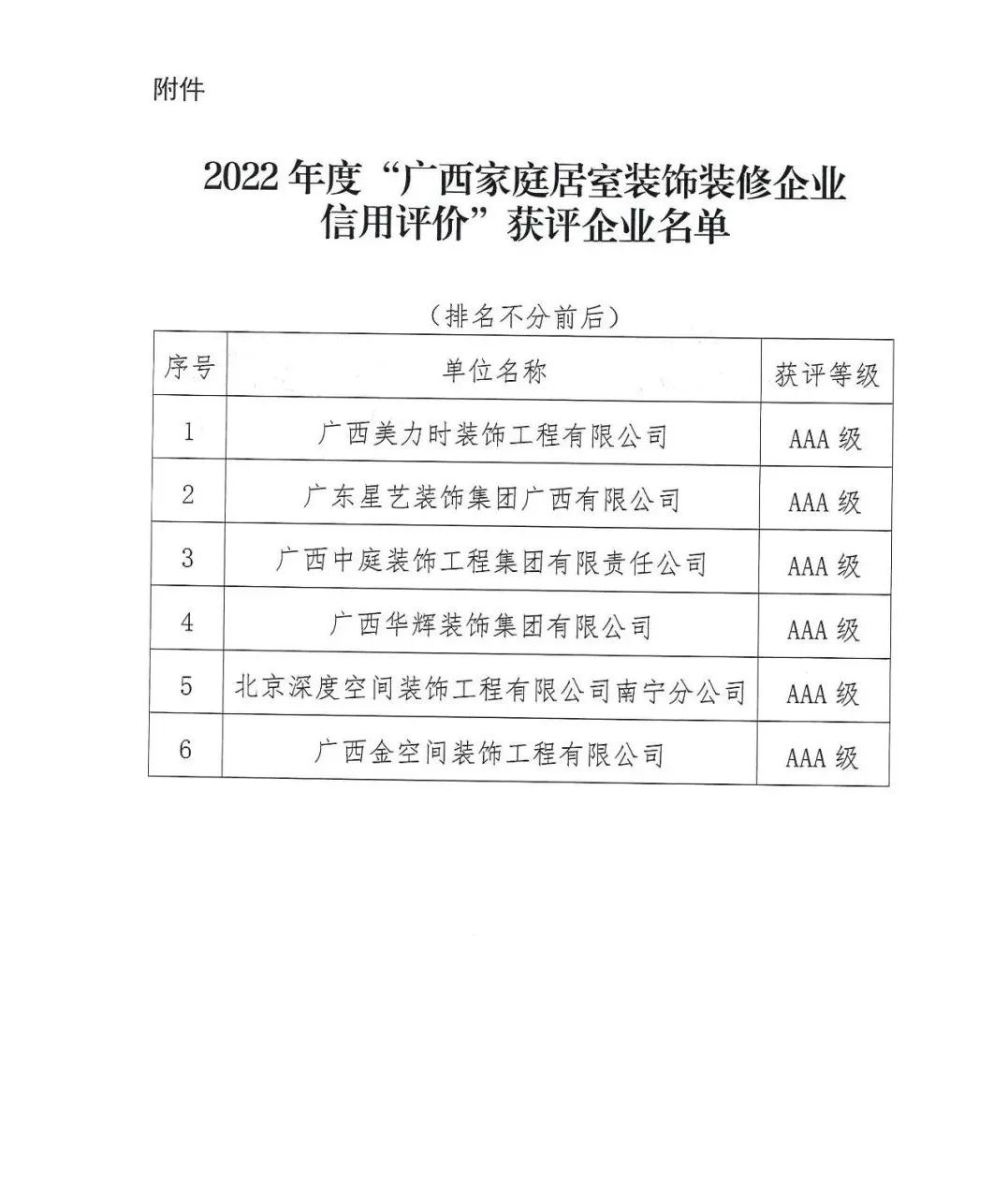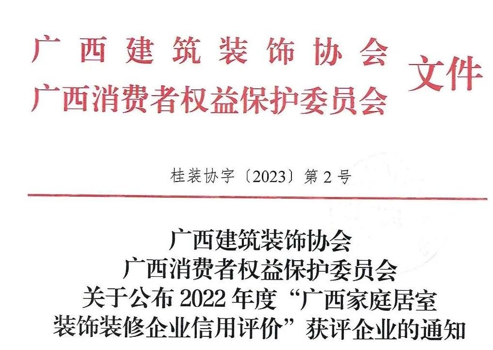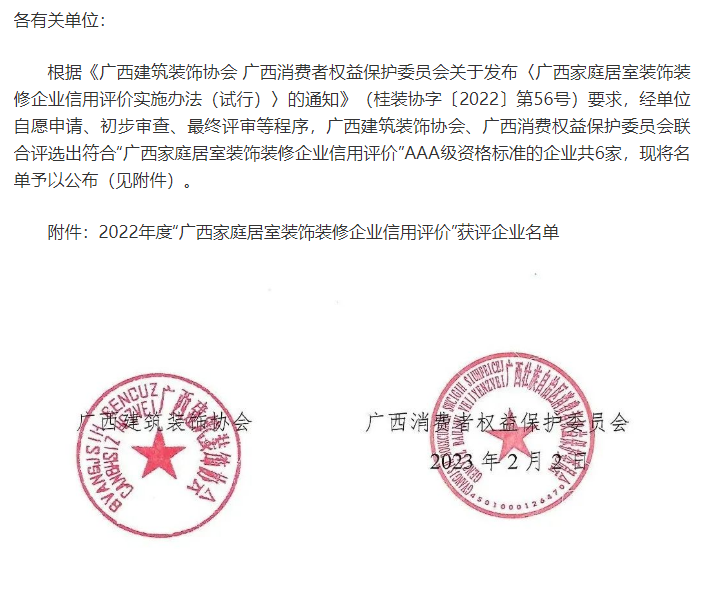 2023年2月2日,广西建筑装饰协会、广西消费者权益保护委员会联合发布通知,评选出符合“广西家庭居室装饰装修企业信用评价”AAA级资格标准的企业共6家,广西太阳成tyc7111cc官网装饰集团有限公司为获评企业之一。